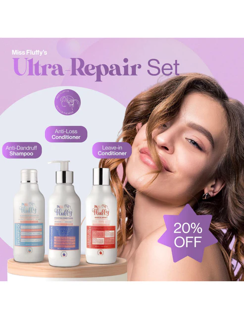 Miss Fluffy Ultra-Repair is an all-in-one hair care set designed to target multiple scalp and hair concerns. This comprehensive bundle includes an anti-dandruff shampoo to treat dandruff, fungus, and itchy scalp; a hydrating conditioner to moisturize and soften hair; and a scalp lotion to reduce hair loss and support regrowth. Together, these products work to restore scalp balance and promote healthier, stronger hair.